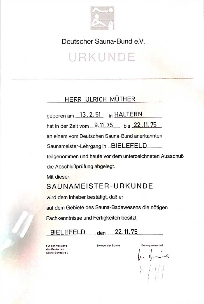 Zur Bestätigung des langjährigen qualifizierten Engagements für den Saunabau präsentieren wir die Saunameister-Urkunde von Herrn Müther, die sogar schon vor 45 Jahren ausgestellt wurde!