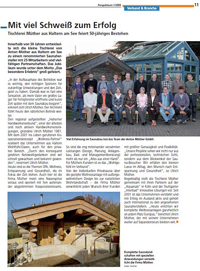 Tischlerei Müther aus Haltern feiert 50-jähriges Bestehen. Innerhalb von 50 Jahren entwickelte sich die kleine Tischlerei von Anton Müther aus Haltern am See zu einem renommierten Saunahersteller mit 25 Mitarbeitern und vielfältigen Partnerschaften.